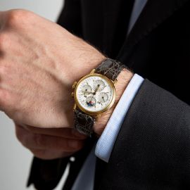 cassa in oro giallo 18kt, fondello a pressione, tasti del crono a oliva, lunetta a scalino, quadrante argenté con quattro contatori, grafica nera e blu, scala tachimetrica, calendario completo, fasi lunari, contatore dei secondi a ore nove, contatore minuti a ore tre, contatore delle ore alle sei, indici applicati, movimento a carica manuale cal 281, cinturino originale in pelle marrone, fibbia in metallo dorato marcata Universal Geneve, vetro plastica, gr. 42. Diam. mm 33. Corredato di scatola e garanzia.
