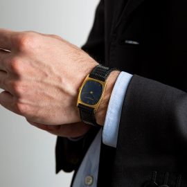 cassa di forma in oro giallo 18kt, fondello a pressione, lunetta liscia in oro giallo 18kt, quadrante blu, grafica oro, indici applicati, movimento a carica manuale cal K1014, cinturino non originale in pelle nera, fibbia in metallo dorato, vetro plastica gr. 27. Dim. mm 25x35