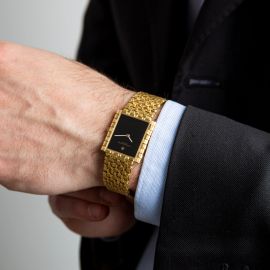 cassa di forma in oro giallo 18kt, fondello serrato con viti, lunetta in oro giallo, quadrante nero (difetti), grafica oro, movimento a carica manuale, bracciale a maglia tessita in oro giallo 18kt, lungh. cm 18,5, chiusura a scomparsa in oro giallo 18kt marcata Vacheron Constantin, vetro minerale, gr. 66. Dim. mm 25x27