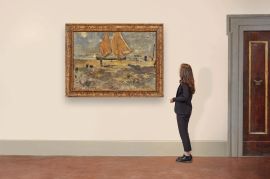 Una brezza leggera immaginiamo accarezzare la spiaggia di Chioggia dipinta del pittore Emilio Gola, ove l’impasto di colore sembra recare con sé il profumo di salsedine. Abile ritrattista, assai apprezzato dalla nobiltà milanese per l’accento mondano e il vigoroso naturalismo della propria pittura, l’artista compì viaggi studio nei Paesi Bassi, in Inghilterra e Parigi, ove conobbe Édouard Manet. La sua spiccata sensibilità luministica e plastica caratterizzerà numerose vedute di Milano e dei paesaggi brianzoli, nonché la produzione ligure e veneta. Ed è certo proprio nelle marine che si impone una grande sintesi formale e intensità espressiva, caratterizzante soprattutto la fase della maturità, in cui è possibile collocare la mirabile veduta della spiaggia Chioggia presentata in catalogo.