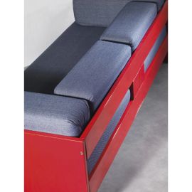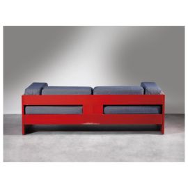 struttura in legno colorato all’anilina rossa, cuscini rivestiti in stoffa nei toni del blu