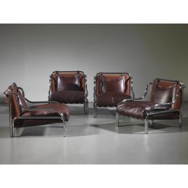 «STRINGA» ARMCHAIRS, TUBULAR METAL STRUCTURE, BORDEAUX LEATHER UPHOLSTERY