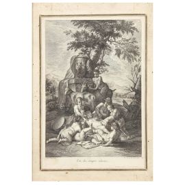 coppia di stampe, acquaforte, carta vergellata applicata su tela, mm 410x270 (totale mm 490x340)