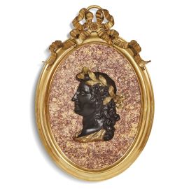 in bronzo patinato e dorato, montati su marmo entro cornice dorata, raffiguranti due profili: uno femminile coronato, l’altro maschile cinto da una corona d’alloro; cm 72x49x8,5