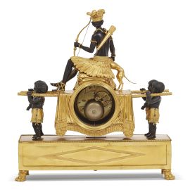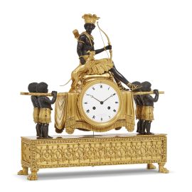La base è costituita da un parallelepipedo sorretto da quattro zampe ferine e ornato sulla fascia da raffinati e preziosi fregi a rilievo, ricchi di rimandi espliciti alla caccia. Sull’alta base sono posti quattro piccoli africani caricati di una portantina centrata dal quadrante circolare e coperta da un drappo impreziosito da pieghe, frange e trafori, sulla quale siede una “cacciatrice” armata di arco e faretra, forse una sorta di “Diana africana”.