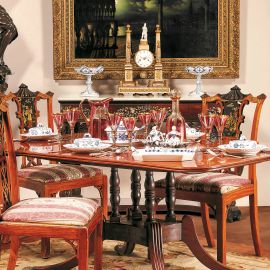 in marmo, bronzo dorato e metallo dorato, composto cassa rotonda sormontata da figura in bisquit con pendolo in forma di sole dorato, sul quadrante reca la firma Orange à Versailles, entro coppia di obelischi terminanti con pinnacolo a sfera e presentanti protomi leonine ed elementi dorati lungo la superficie scanalata su basamento con panoplie, la base in marmo con fregio in bronzo dorato a girali vegetali su otto piedi a trottola; completo di chiave, cm 57x40x17