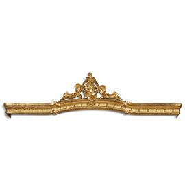 in legno dorato e intagliato, fascia incisa a fogliette stilizzate entro cornice a lunghe volute ricorrenti, cimasa a giorno scolpita a volute a ricciolo poste a inquadrare motivo rocaille a foglia aperta; cm 38x168x24 (4), cm 38x168x38 (2)
