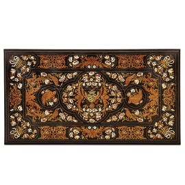 riccamente intarsiato in legni vari e madreperla, reca sul piano schema tripartito che vede nella riserva centrale uno stemma araldico bipartito della famiglia Pallavicino e Dolfin di Venezia, in quelle laterali uccelli su ramo fiorito, entro cornici intarsiate con motivi fogliacei, fiori ed uccelli, cantoni con mazzetto di fiori entro riserva, fascia sottopiano analogamente lavorata con ricco intarsio a girali e fiori scandito da cartelle, sottile dado a doppia voluta riposa su gambe troncopiramidali; cm alt.88x144x78