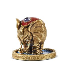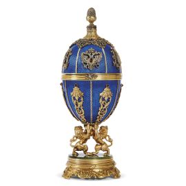 in smalto blu traslucido, diamanti a rosette e rubini cabochon con montatura in oro e metallo dorato, il coperchio è sormontato da motivo a pigna che scende su decori a girali, ed è impreziosito da emblemi della Casa Imperiale russa intervallati da monogrammi dello Zar Alessandro III; all’interno presenta un elefante in oro parzialmente smaltato; la parte inferiore del guscio è decorata con applicazioni a motivi fogliacei intrecciati ed è sostenuta da coppia di leoni rampanti affrontati su base circolare con volute rocaille; alt. cm 20