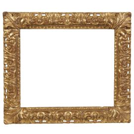 in legno intagliato e dorato, battuta a unghiature sale su fascia traforata a foglie aperte verso l’esterno e quattro foglie d’acanto agli angoli; ingombro cm 36,5x42, luce cm 25,5x30,5