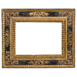 in legno intagliato, dorato ed ebanizzato, battuta lavorata a più ordini di perlinature si porta su a cassetta ebanizzata ed ornata da decori dorati e rilevati a volute fogliecee sui centri ed agli angoli, termina su profilatura dorata; ingombro cm 37,5x47, luce cm 28,8x20,4
