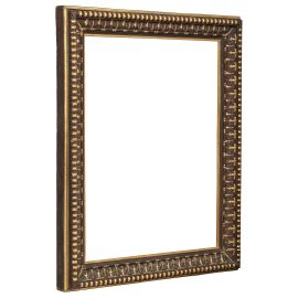 in legno intagliato e dorato, battuta dorata si apre su profilo a perline e fusarole e su fascia a foglie aperte che scende su profilatura a unghiature e si porta a muro con più ordini di modanature; ingombro cm 122x98, luce cm 97x74,5
