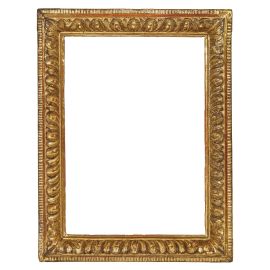 in legno intagliato e dorato, battuta si porta su fascia aggettante scolpita da motivo a baccellature estroflessa, cade a muro con dentellatura; ingombro cm 39,5x30, luce cm 30,5x21,5