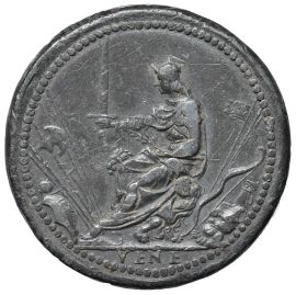 Pb mm. 31 AVGVSTINVS BARBADIC VENETOR DVX Busto a s. con corno dogale e lunga barba R/ Venezia seduta su un trono, sostenuto da un leone, brandisce una spada. Es. VENE Rif: Armand II, 4; Rizzini II, 494; Volt. 1276