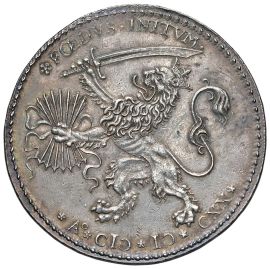 Ar gr. 35,80 mm. 50 Anepigrafe. Il Leone di San Marco in maestà sorgente dalle acque sostiene fra le zampe lo stemma del Doge Priuli R/ FOEDVS INITVM A O MDCXX (Alleanza ratificata nell’anno 1620). Il Leone olandese, rampante a s., brandisce con la zampa d. la spada e con la s. il fascio delle sette frecce, rispondenti al numero degli Stati olandesi. Rif: Volt. 885; Majer 1924, pp. 178-9.