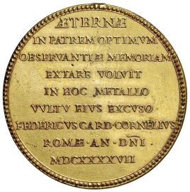 Aed mm. 48 IO CORNELIVS DVX VENET OBIIT A D MDCXXIX Busto del Doge a s. con corno dogale e mantello R/ ÆTERNÆ IN PATREM OPTIMVM OBSERVANTIÆ MEMORIAM EXTARE VOLVIT IN HOC METALLO VVLTVS EIVS EXCVSO FEDERICVS CARD CORNELIVS ROMÆ AN MDCXXXXVII su nove righe Rif: Vannel-Toderi 501 Volt. 937 (Museo Correr)