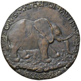 Ae mm. 81 ISOTE ARIMINENSI FORMA ET VIRTVTE ITALIE DECORI Busto a d. velato R/ OPUS MATHEI DE PASTIS Elefante malatestiano verso d. su terreno erboso. Sotto MCCCCXLVI Rif: Hill tav. 32, n. 167
