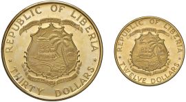 LIBERIA. REPUBBLICA (DAL 1847). DUE MONETE IN ORO 900 (30 E 12 DOLLARI 1965) PER IL 70º COMPLEANNO DEL PRESIDENTE TUBMAN