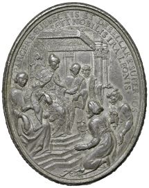 Sn gr. 110,62 mm. 72x57 PARCERE SUBIECTIS ET DEBELLARE SUPERBOS SCIT NOBILIS IRA LEONIS Il Doge seduto in trono al centro della scena sotto un regale baldacchino è affiancato da tre consiglieri in atto di ricevere, inginocchiati in segno di resa, i fratelli Mustafà Pascià e Hassan Pascià R/ EX UTROQVE VICTOR Il Leone di San Marco vittorioso, rampante a s., con la d. brandisce una spada avvolta da ramo d’alloro e con la s. stringe un delfino, simbolo del dominio del mare. Al suolo freccia e arco spezzati. Nel taglio: SERENISSIMI LEONIS LATI SOLO SALOQUE TURCARUM VICTORIS TRIUMPHALE FLORILEGIUM 1687 Rif: Volt. 1054; Milford Heaven 88, Vannel Toderi 1990, 54.