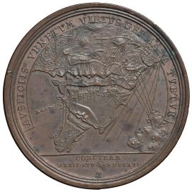 Ae mm. 49 Busto a d. con parrucca R/ Veduta prospettica della città di Corfù con indicato il raggio di azione delle artiglierie Rif: Volt. 1387