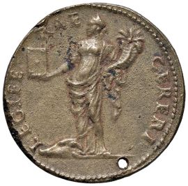 Forata. Coniazione coeva con patina bronzo dorato. Rara. BB Holed. Coeval coinage with gilt-bronze patina. Rare. VF
