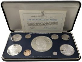 PANAMA. REPUBBLICA. ZECCA DI FRANKLIN. SERIE COMPLETA DI OTTO VALORI IN ARGENTO E UNO IN RAME (URRACA) 1976 IN ASTUCCIO ORIGINALE E CERTIFICATO DI EMISSIONE