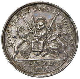 Ar gr. 5,89 mm. 26 QVOS TRINVS IVNXIT FOEDERE Gruppo allegorico di tre leoni impugnanti una spada a rappresentare l’alleanza tra le città di Zurigo, Berna e Venezia (al centro). Es. FIRMET AMOR R/ SER REIP VENETAE CVM ILL REB P TIGVR ET BERN RENOV FOEDERIS MONVMENTVM 1706 Scritta in sette righe Rif: Volt. 1346