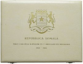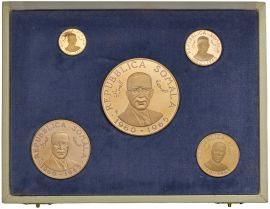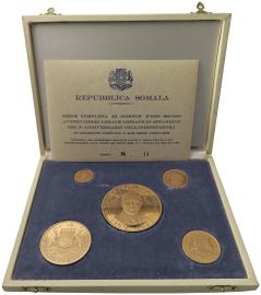 SOMALIA. REPUBBLICA. IN OCCASIONE DEL V ANNIVERSARIO DELL’INDIPENDENZA (1960-1965). SERIE COMPLETA DI CINQUE VALORI IN ORO 900 (20.000, 10.000, 5.000, 3.000 E 1.000 FRANCHI 1969) IN ASTUCCIO ORIGINALE E CERTIFICATO DI EMISSIONE NUMERATO 106 (MINTAGE 8.000)