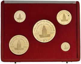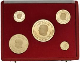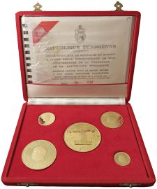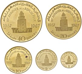 TUNISIA. REPUBBLICA (DAL 1957). PROOF SET COMPOSTO DA CINQUE MONETE IN ORO 900 (40, 20, 10, 5 E 2 DINARI 1967) CHE COMMEMORANO IL 10° ANNIVERSARIO DELLA REPUBBLICA IN ASTUCCIO ORIGINALE E CERTIFICATO DI EMISSIONE N. 536 (MINTAGE 8.000)