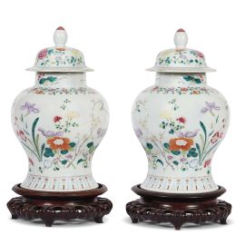 dotati di coperchi in porcellana policroma, decorati con i fiori più importanti della Cina. Il manico del coperchio è a forma di loto chiuso e sul collo sono presenti foglie e fiori di loto. Sulla spalla è presente un modulo di rose a rami continui e decorazione floreale sulla pancia. Il piede è stato decorato con petali stilizzati.