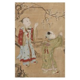 su carta raffigurante due bambini che fanno volare due aquiloni a forma di calligrafie Fu e Shou. Il dipinto reca la firma Jiao Bingzhen.