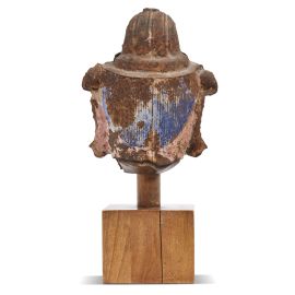 in ferro, con tracce di colore blu e rosa sulla superficie posteriore del capo. Viso raffigurante Bodhisattva. Gli occhi sono leggermente aperti e clementi. Il profilo tra il sopracciglio e il naso ha lineamenti continui, legati tra di loro. Le guance sono tonde e la bocca sinuosa. I lobi delle orecchie sono allungati e tondeggianti. Probabilmente il soggetto indossava una corona e parte della sua decorazione è rimasta visibile appena al di sopra delle orecchie. La sua capigliatura è ordinata ed è parzialmente raccolta nel copricapo sovrastante.