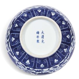 Il raro Shang Ping in porcellana bianco blu con decorazione a fiori di loto e rami avvolgenti. Il suo bordo superiore è decorato con onde stilizzate; il collo presenta foglie di palme stilizzate (modulo Jiaoye 蕉叶纹) poste su una base a nastro continuo caratterizzata da motivi geometrici (modulo Hui 回纹); la spalla è composta da due file di elementi decorativi, di cui la prima floreale e la seconda, quella immediatamente inferiore, da nuvole stilizzate a forma di funghi Ruyi (modulo Ruyishi Yuntou 如意式云头纹); la decorazione della pancia mostra sei grandi fiori di loto centrali di diversi stili, contraddistinti da una colorazione blu che conferisce tridimensionalità a tutti gli elementi decorativi. I loti sono comunicanti tra di loro grazie a sottili rami floreali. L’intero apparato decorativo si sviluppa su tutta la superficie esterna della pancia ed alla base di essa si hanno petali di loto stilizzati; Il bordo inferiore del piede è leggermente estroflesso; sul piede c’è una decorazione a girali stilizzati continui alla cui base è presente il marchio Daqing Guanxu Nian Zhi in sei caratteri. Il colore bianco albume della porcellana è coevo con il periodo Guanxu.