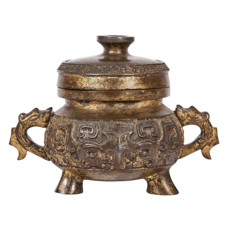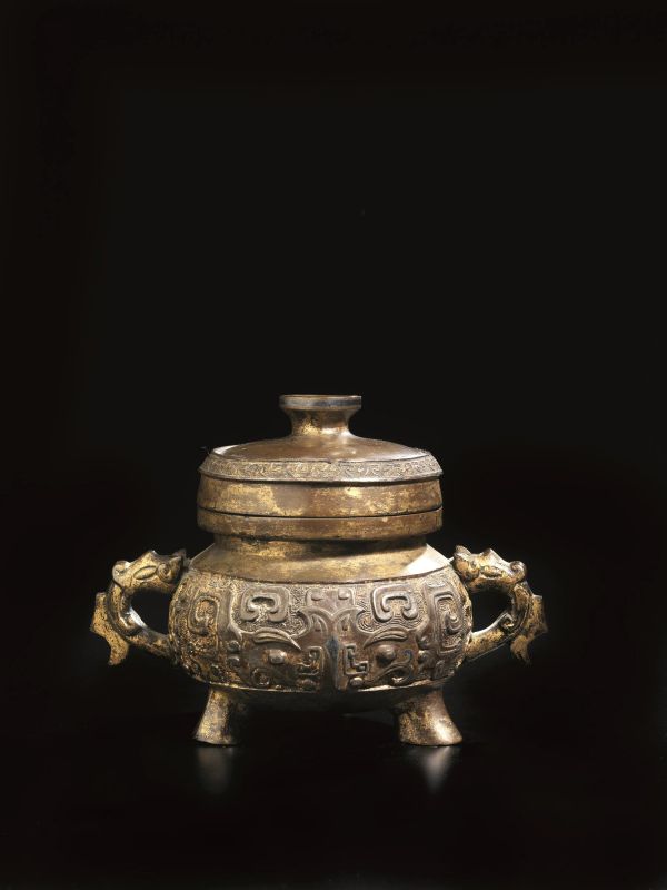 in bronzo dorato, su tre piedi dal corpo bombato e decorato con motivo di taotie e le anse a forma di draghi.
