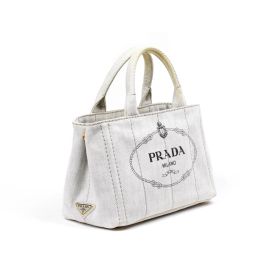 Piccola borsa a mano molto raffinata, in tela denim beige/grigio con logo frontale stampato in nero e caratteristico piccolo logo in metallo smaltato a forma triangolare su un fianco. Interno in stesso tessuto con due tasche aperte e una chiusa con zip. Metalleria in color oro. Con tracolla staccabile e regolare in nastro in grigio.