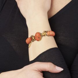 in oro giallo 18kt, composto da elementi in corallo con motivi figurati incisi, fermatura in metallo, lungh. cm 16,5 circa, gr. 24