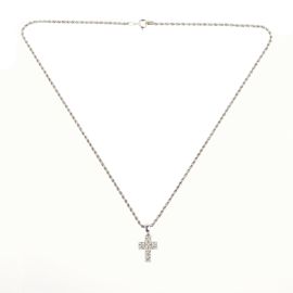 in oro bianco 18kt, composta da catena a cordicella e pendente a forma di croce impreziosita da diamanti taglio brillante per ct 0.30 circa, punzoni 750 e del fabbricante, lungh. cm 45, gr. 5