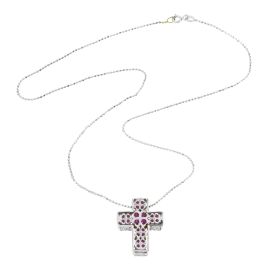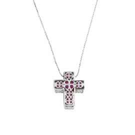 in oro bianco 18kt, con un ciondolo a forma di croce raffigurante dei quadrifogli impreziositi su un lato da diamanti taglio brillante per ct 0.30 circa, e nell'altro da rubini taglio rotondo per ct 0.30 circa, punzoni 750 e del fabbricante, lungh. cm 44,5, gr. 10