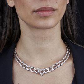 in oro bianco 18kt, realizzata seguendo un motivo a catena unita al centro da una maglia a forma di cuore, impreziosita da diamanti taglio tapes e baguette per ct 11 circa, punzoni 18kt e 750, lungh. cm 36, gr. 55