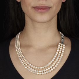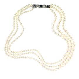 composta da tre fili di perle leggermente digradanti di mm 7-5 circa, fermatura in platino impreziosita da tre zaffiri taglio sugar loaf e diamanti taglio vecchio e a rosa per ct 0.40 circa, lungh. cm 51,5, gr. 86
