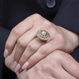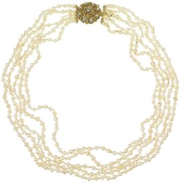composta da cinque fili di perle di fiume, fermatura in oro giallo 18kt lavorata a cordicella e raffigurante un motivo floreale, lungh. cm 17; accompagnata da un anello in oro giallo 18kt, impreziosito da rose di diamante e una pietra sintetica, mis. 54, gr. 52 complessivi circa