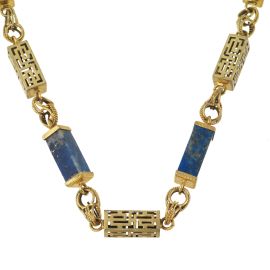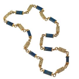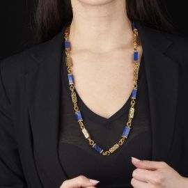 in oro giallo 18kt, composta da collana e paio di orecchini, collana realizzata a catena con una serie di elementi rettangolari traforati alternati a cilindri in lapislazzuli, lungh. cm 75, dim. orecchini cm 1,5x2 circa, chiusura a clip con perno, gr. 79 complessivi