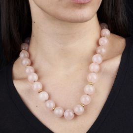 di cui una con sfere in quarzo rosa, fermaura e distanziali in oro giallo 18kt, punzone 750, lungh. cm 51,5; accompagnata da una seconda collana a cinque fili di cilindri in lapislazzuli di mm 10x4 circa, fermatura e distanziali in oro giallo 18kt, lungh. cm 49,5, gr. 297 complessivi circa