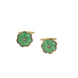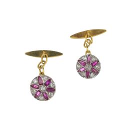 in oro e argento, raffiguranti motivi floreali, di cui uno impreziosito da rubini taglio fantasia e diamanti taglio vecchio per ct 0.50 circa, dim. cm 1x2 circa; accompagnato da un secondo paio di gemelli decorati in smalto verde, punzone 750, dim. cm 1,5x1,5 circa, gr. 15 complessivi