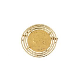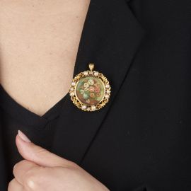 di cui una di forma circolare in oro giallo 18kt, con al centro un dipinto floreale entro cornice a tralci, circondata da perle di mm 3 circa e diamanti taglio huit huit per ct 0.10 circa, indossabile anche come pendente grazie al passante, punzoni 750 e del fabbricante, dim. cm 3,5x4,5; accompagnata da una seconda spilla con moneta, gr. 24 complessivi