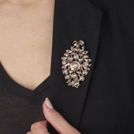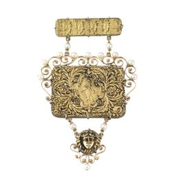 di cui una composta da elementi pendenti in metallo dorato cesellato cinti da motivi a volute con perle di mm 3 circa, dim. cm 5,5x9 circa, gr. 17, accompagnata da una seconda spilla a tralcio fiorito in argento foderato in oro a basso titolo, impreziosita da rubini e rose di diamante, dim. cm 4x6,5, gr. 27
