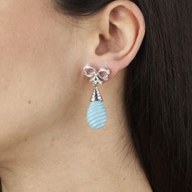 in oro bianco 18kt, realizzati a forma di fiocchi impreziositi da diamanti taglio brillante e huit huit per ct 0.40 circa, con due elementi a goccia in pasta di turchese dalla superficie scanalata, chiusura a farfallina, punzone 750, dim. cm 1,5x4 circa, gr. 15 complessivi