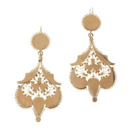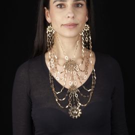 in oro 9kt, composta da paio di grandi orecchini pendenti di dim. cm 4,5x10 circa, con chiusura a monachella, e ampia collana pettorale con alle estremità due ganci da inserire nei lobi come orecchini, da cui si diramano varie catene unite al centro da elementi solari recanti al centro dei cuori, lungh. cm 35 circa, gr. 62