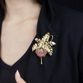 FLOWERING BRANCH-SHAPED BROOCH IN 18KT YELLOW GOLD AND SILVER