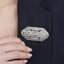 in oro e argento, di forma geometrica, impreziosita da diamanti taglio vecchio per ct 2.50 circa, dim. cm 6x3, gr. 13